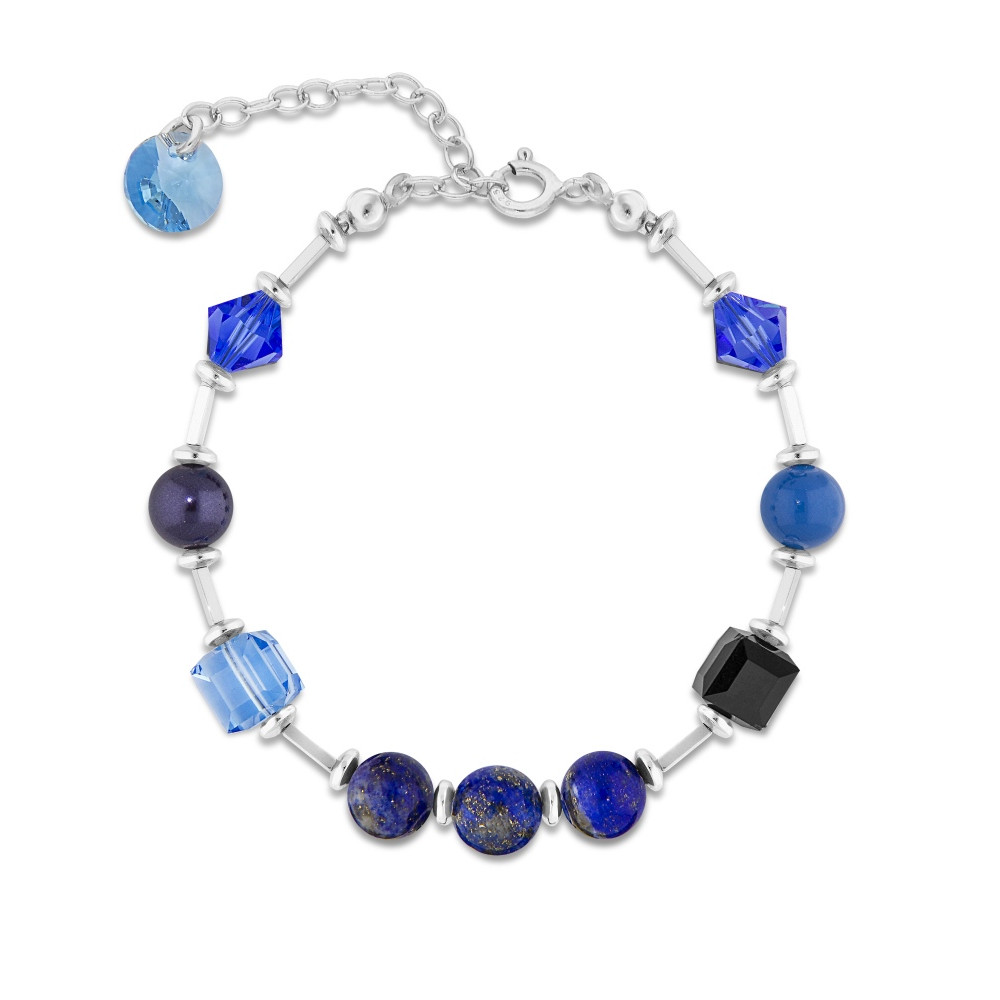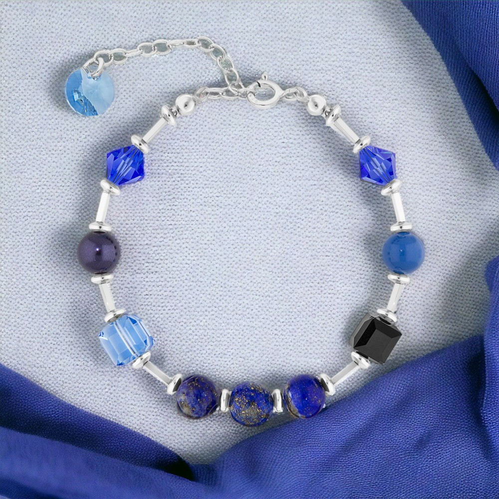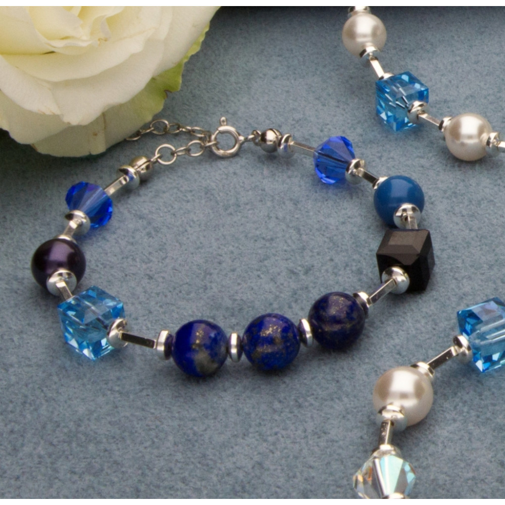 Naszyjnik wykonany ze srebra próby 925, hematytów, kamieni naturalnych Lapis Lazuli, austriackich kryształów w kolorze Aquamarine, Sapphire i Jet oraz kryształowych pereł w kolorze Dark Purple i Lapis.