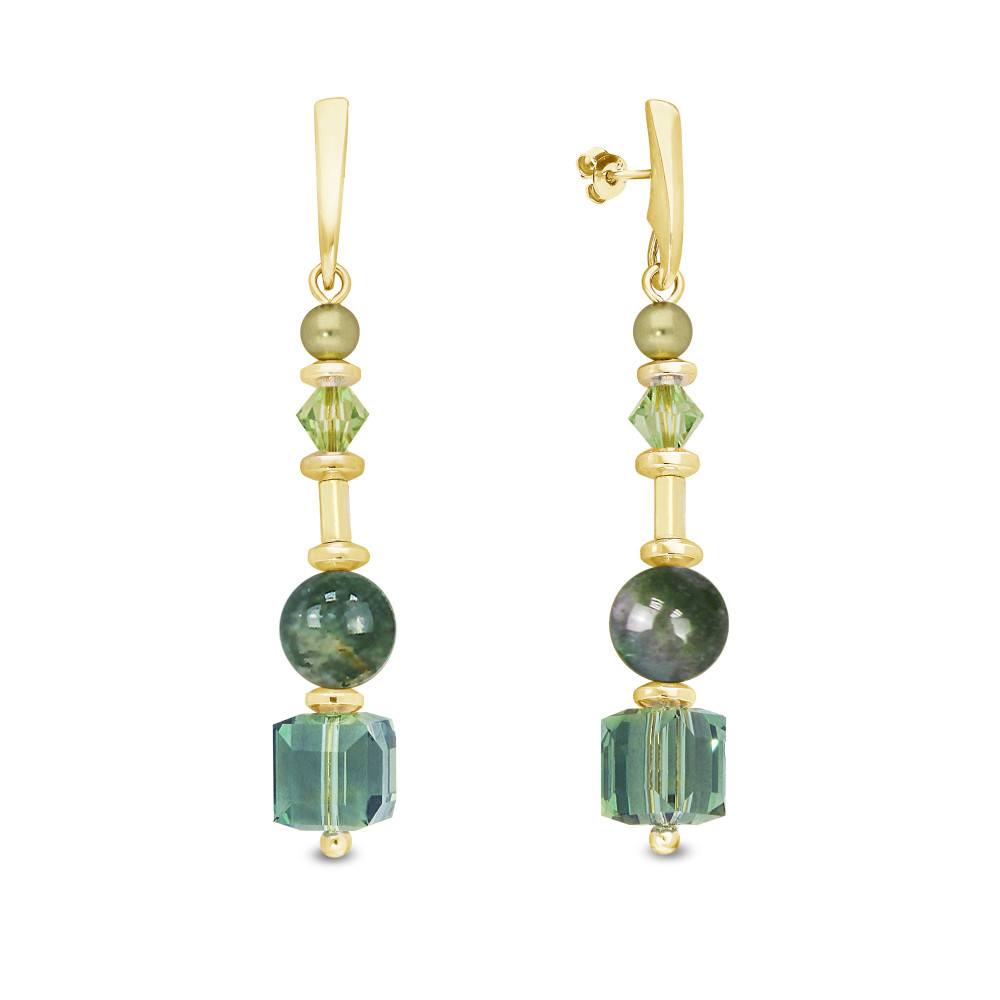 Neklace made of gold plated 925 sterling silver, hematite, natural stones Indian Agat, Austrian crystals in colour Peridot and Erinite and Crystal Pearls in colour Light Green.