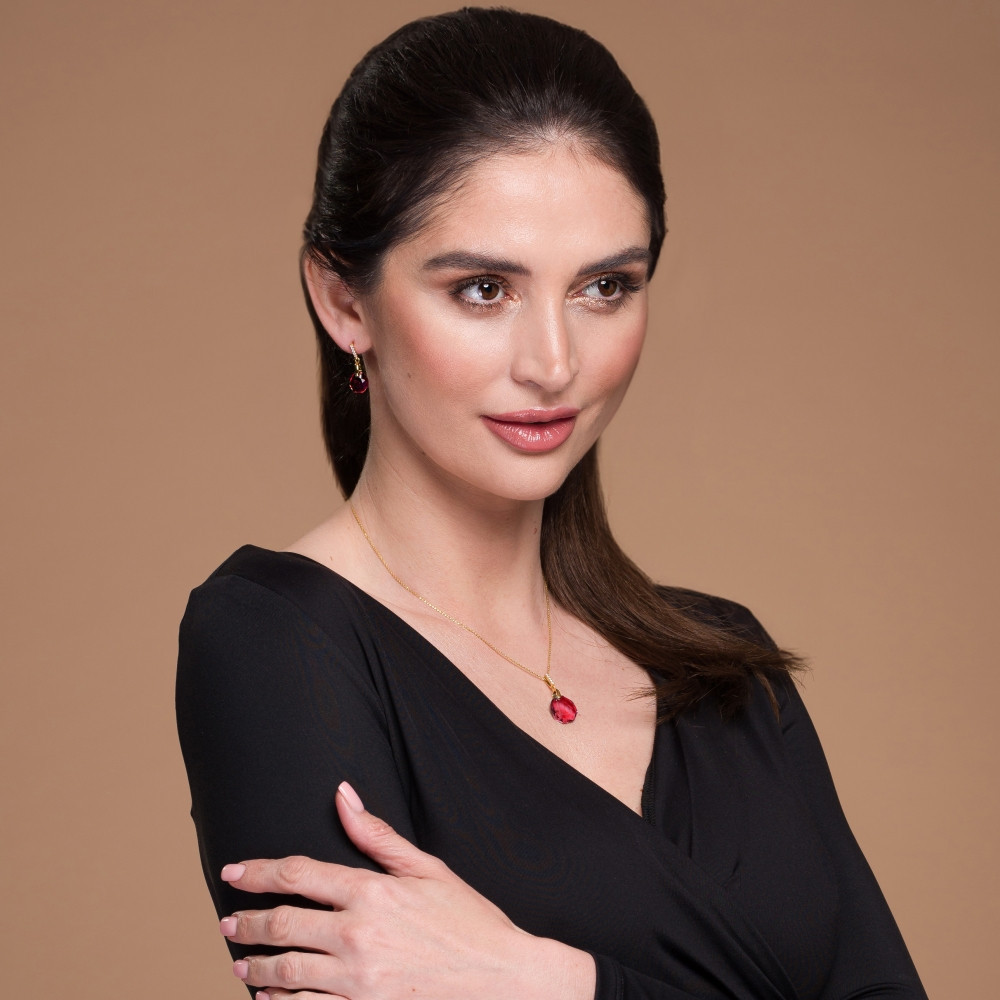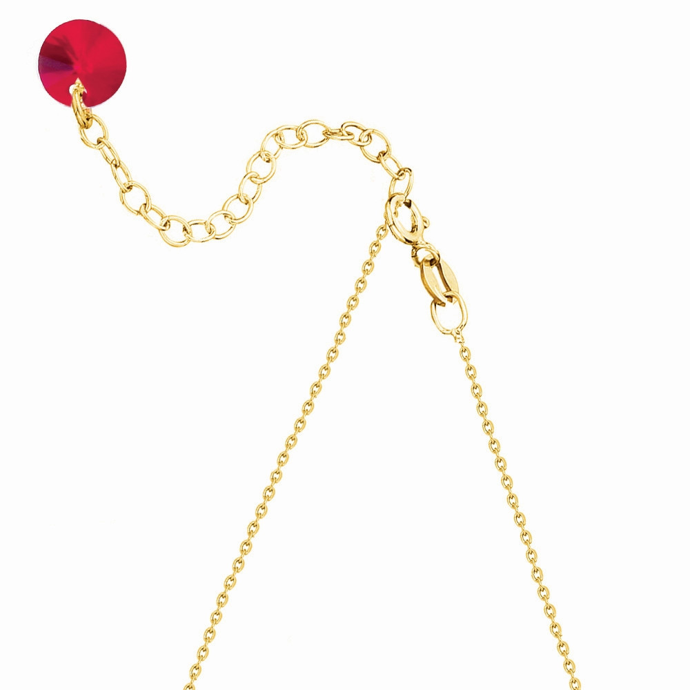 Necklace made of 925 sterling silver plated with platinum, zircons and Austrian crystals in color Scarlet.Chain length: 47 cm (42 cm + 5 cm extension).Pendant length: 3 cm.Crystal size: 1,6 cm.