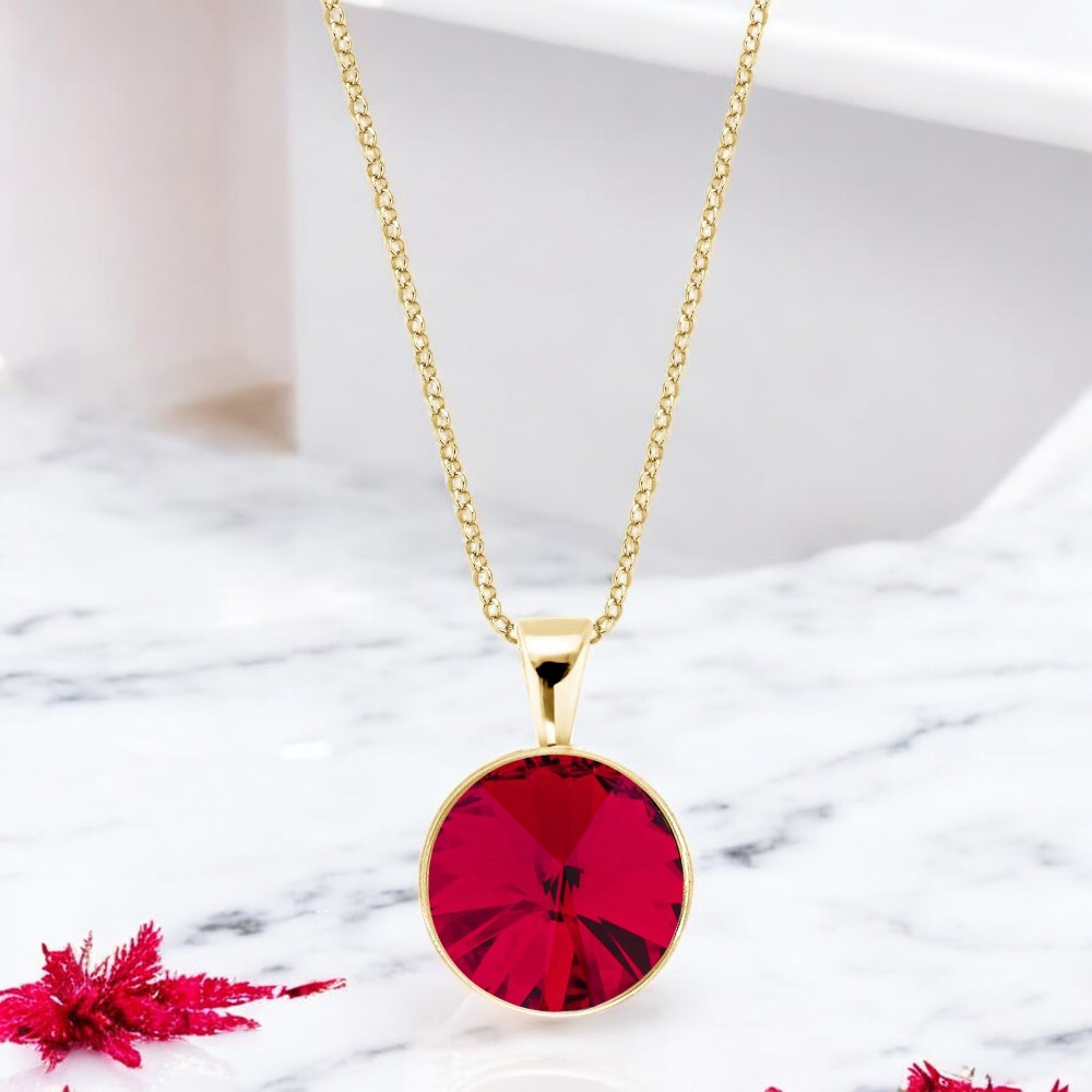 Discover the exquisite charm of elegance and luxury embodied in this silver gold-plated necklace. At its heart lies a round Austrian crystal in a deep ruby hue, captivating with its intensity and sophistication.Understanding