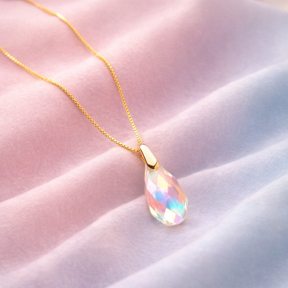 The BRIOLETTE necklace is a refined expression of timeless elegance. Its slim, faceted Swarovski® crystal in a delicate drop shape captures and reflects light beautifully, creating a soft, luminous effect.