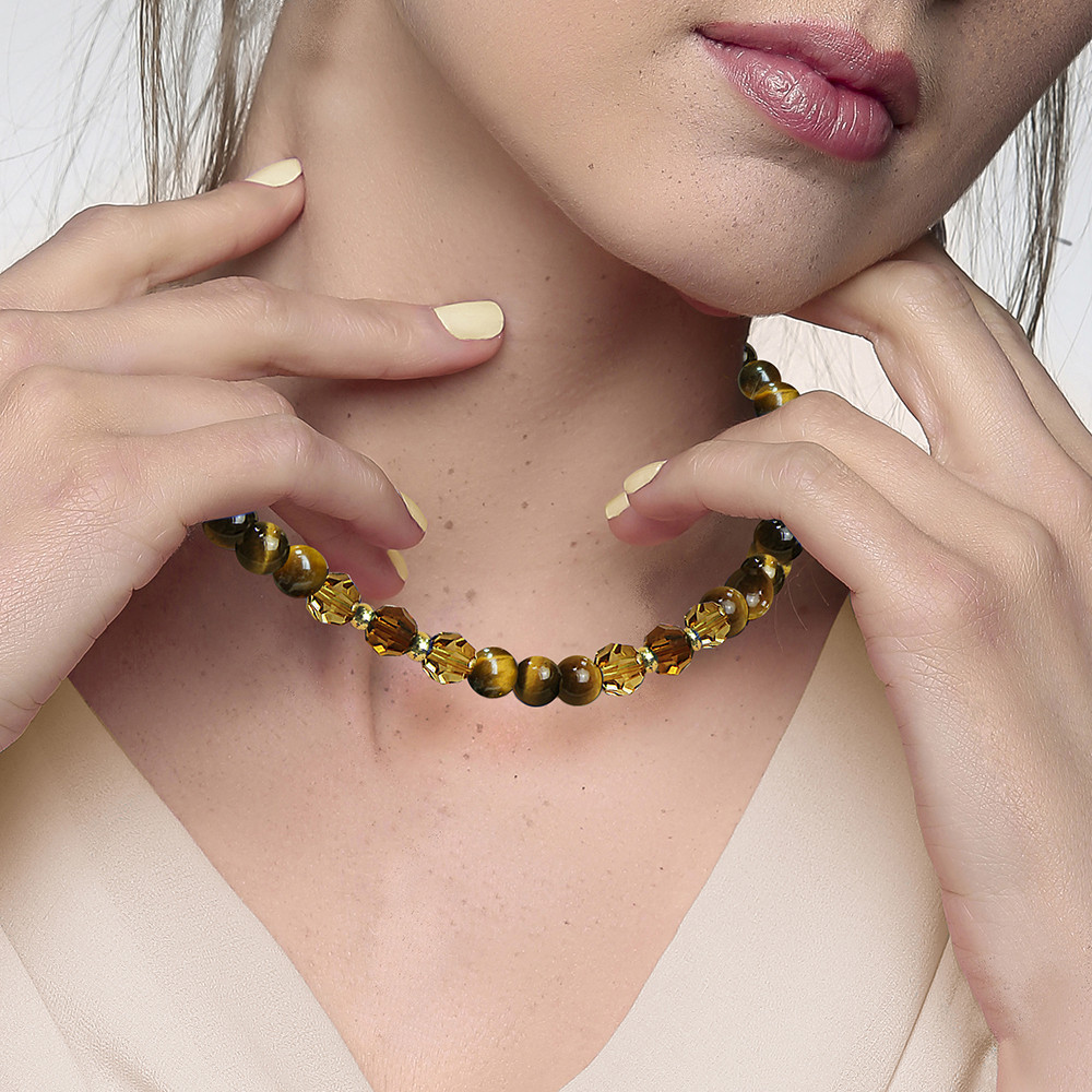 Earrings made of gold plated 925 sterling silver and exclusive Austrian crystals in colours Light Amber and Golden Topaz and natural stones - Tiger Eye.
