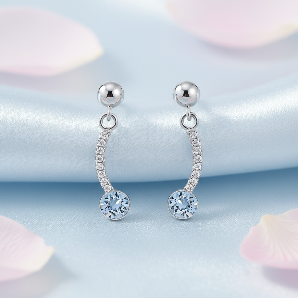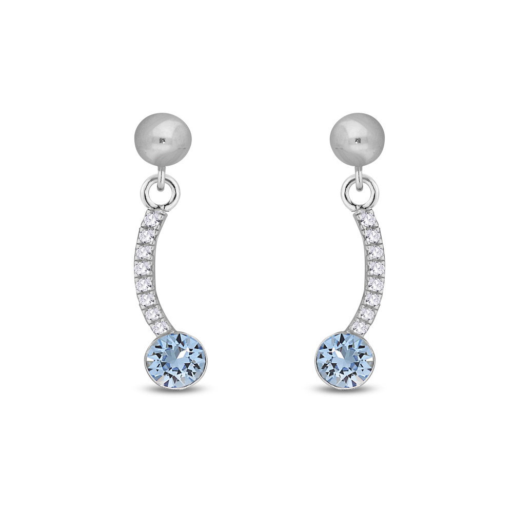 The LUSTRELLA earrings in sterling silver stand out with their contemporary, refined design. The curved line adorned with white Swarovski® crystals highlights the blue crystal at the base, creating a luminous contrast that enhances any style.