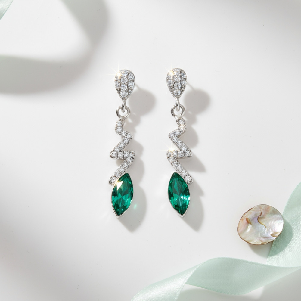 The SERPENTIN earrings combine modern elegance with a vibrant, luxurious sparkle. Their distinctive zigzag silhouette, adorned with delicate white Swarovski® crystals, leads to a deep green navette-shaped crystal that evokes the richness of precious gemstones. Crafted from 925 sterling silver, these earrings offer both refinement and durability.
