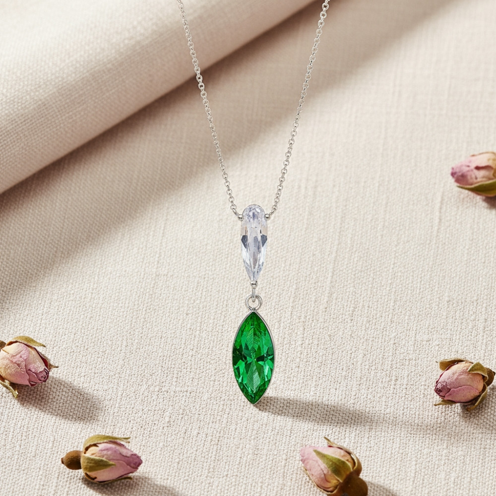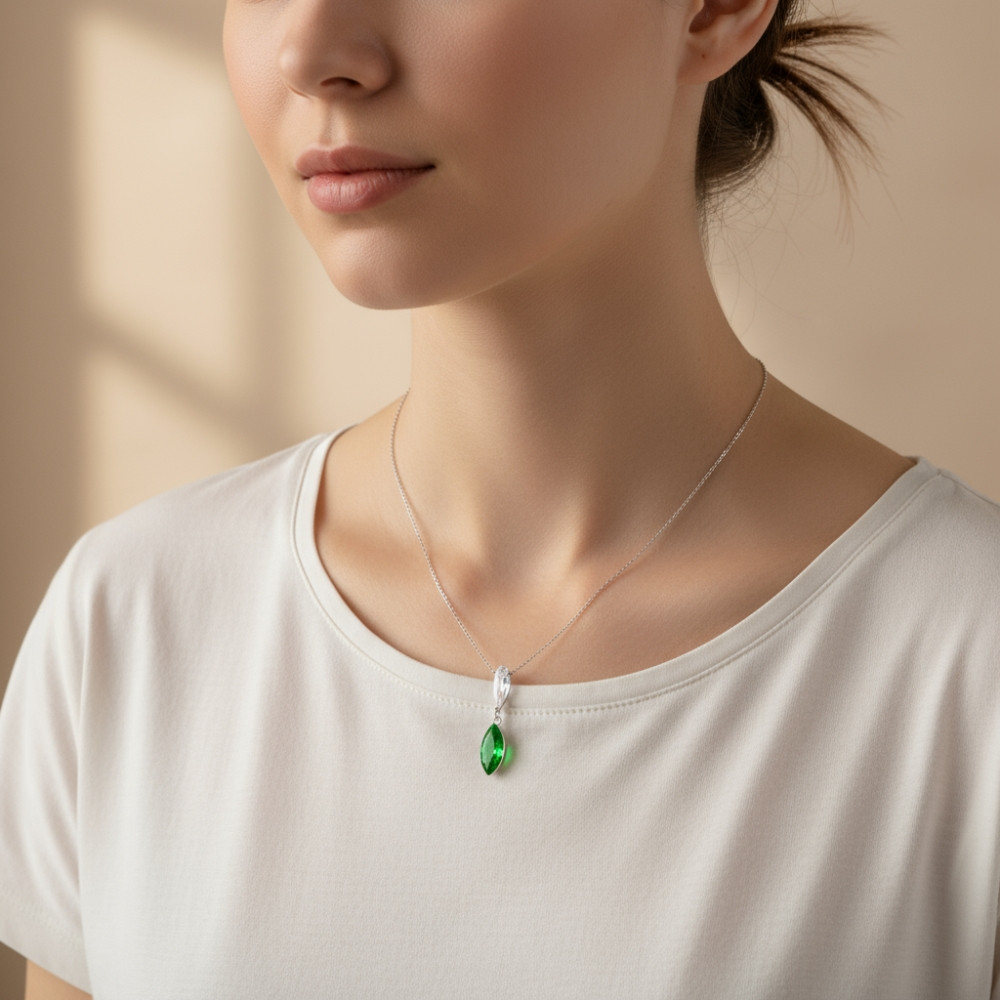The GLACIENNE necklace blends refined elegance with vibrant colour. Crafted in genuine sterling silver, it features a slender pendant adorned with a marquise-cut green Swarovski® crystal that glows with incredible intensity. Its fresh and modern design makes it the perfect statement piece for everyday wear or special occasions.