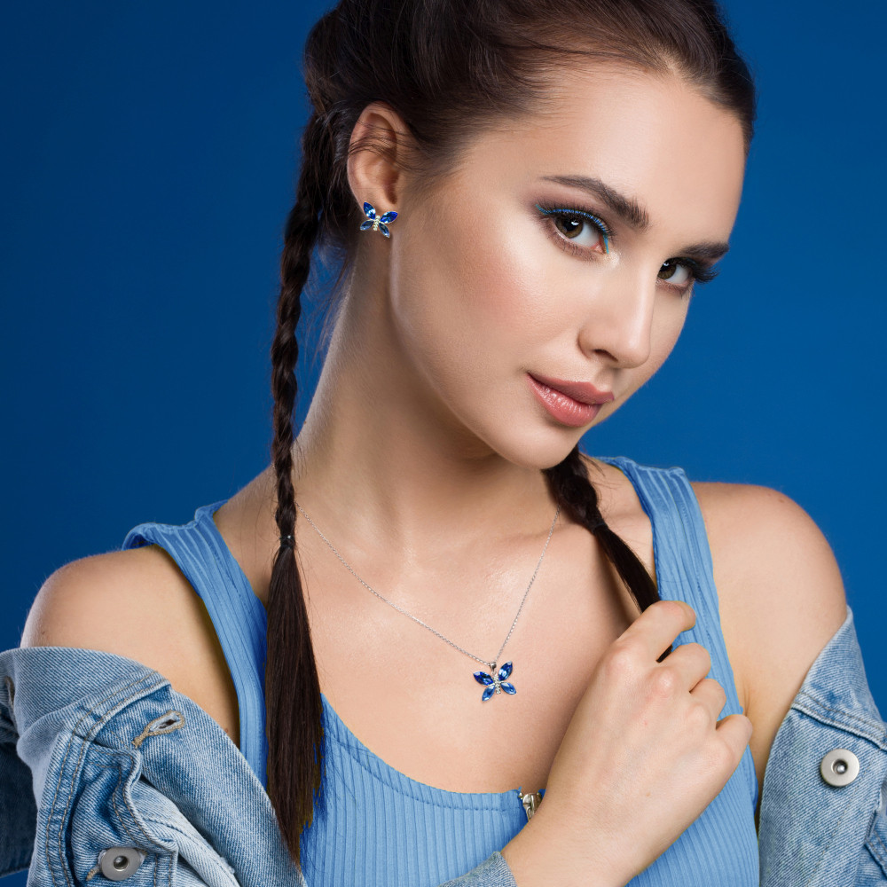 Earrings made of platinum plated 925 sterling silver and Austrian crystals in colour Sapphire.Size of the earrings: 1,4 cm.