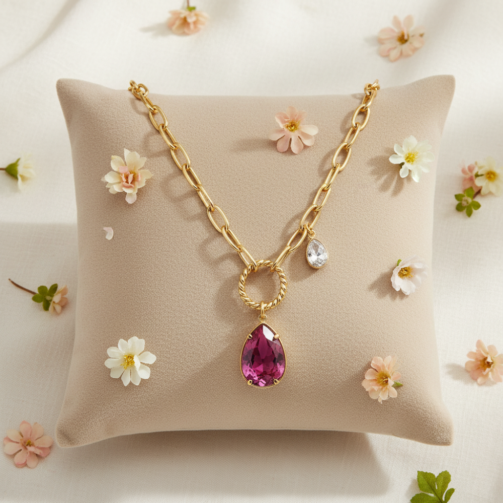 The ILLUSION necklace embodies contemporary charm and radiant femininity. Crafted in gold-plated stainless steel, it features a wide-link chain and a teardrop pendant adorned with a pink Swarovski® crystal. This bold and luminous piece of jewelry catches the light and enhances every movement.