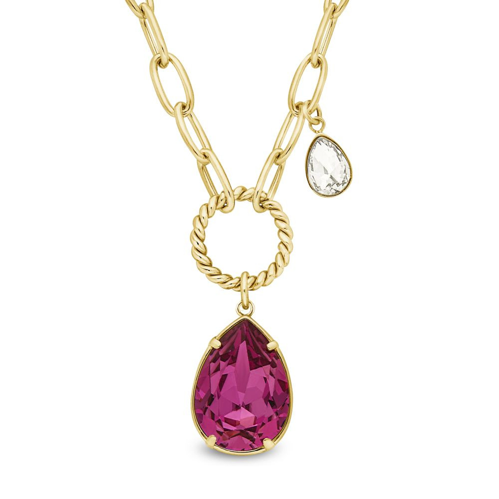 With its faceted teardrop and twisted gold ring, the ILLUSION necklace combines modern design with glamorous appeal. Its intense pink hue and refined gold plating make it the perfect accessory to enhance a chic outfit, whether it's a daytime look or an elegant evening ensemble.