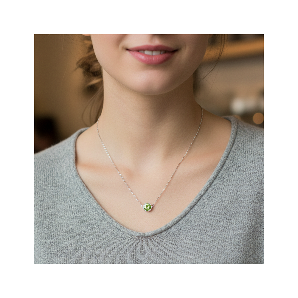 The SCINTILLE necklace combines minimalism and elegance. Its 6 mm green Swarovski® crystal sparkles beautifully with every movement, creating a delicate and modern look. Lightweight and timeless, this necklace is perfect for everyday wear as well as for more dressed-up occasions.
