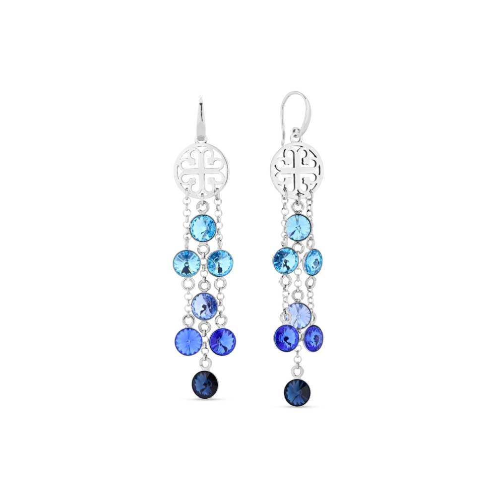 Boucles d'oreille en argent 925 rhodié ornées de cristaux de couleur Sapphire, Aquamarine et Montana.Longueur des boucles d'oreille: 3.8 cm.