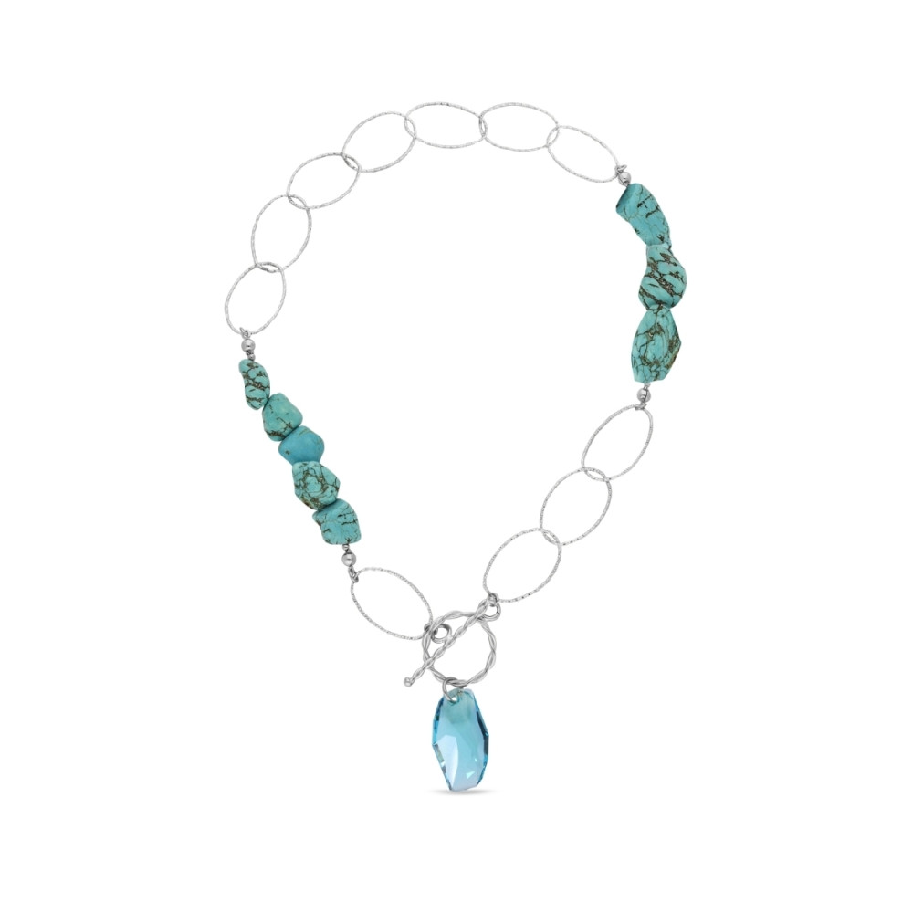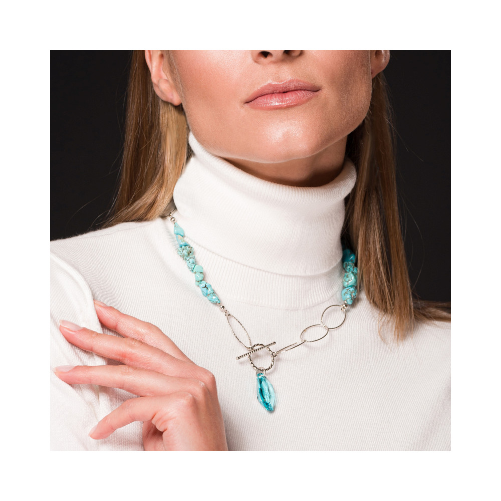 Collier en argent sterling 925, cristaux autrichiens exclusifs de couleur turquoise clair et pierres naturelles turquoise.Longueur du collier : env. 47cm. Longueur pendentif : 3,2 cm.
