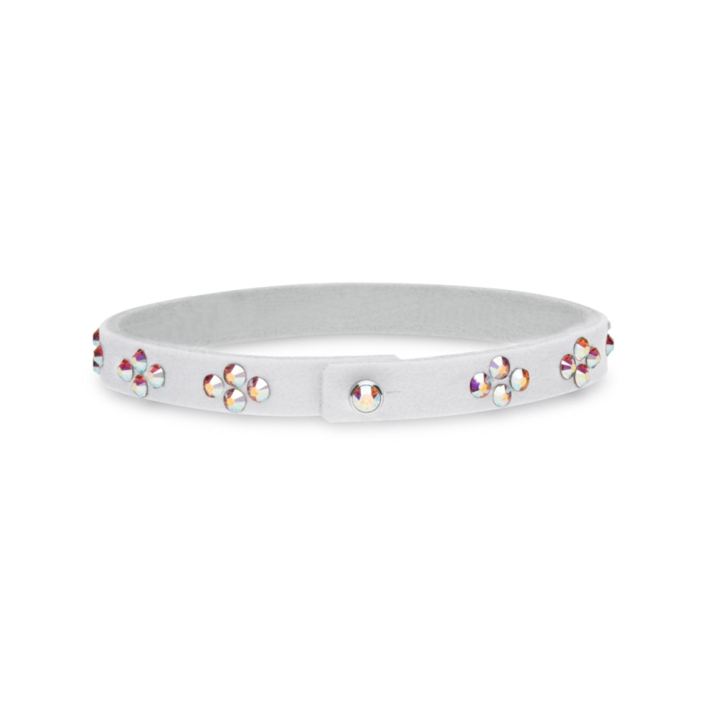Bracelet en Alcantara® blanc orné de cristaux de couleur Aurora Borealis.Longueur du bracelet: 18.5 cm.Largeur du bracelet: 2.5 cm.