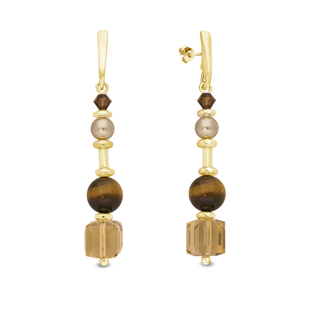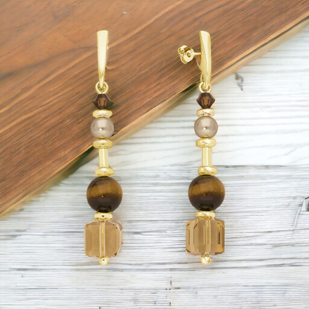 Bracelet en argent sterling 925 plaqué or, hématite, pierres naturelles Oeil de Tigre, cristaux autrichiens de couleur Smoked Topaz, Light Topaz et Light Colorado Topaz et perles de cristal de couleur Bronze et Bright Gold.