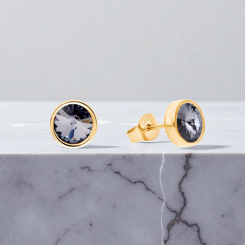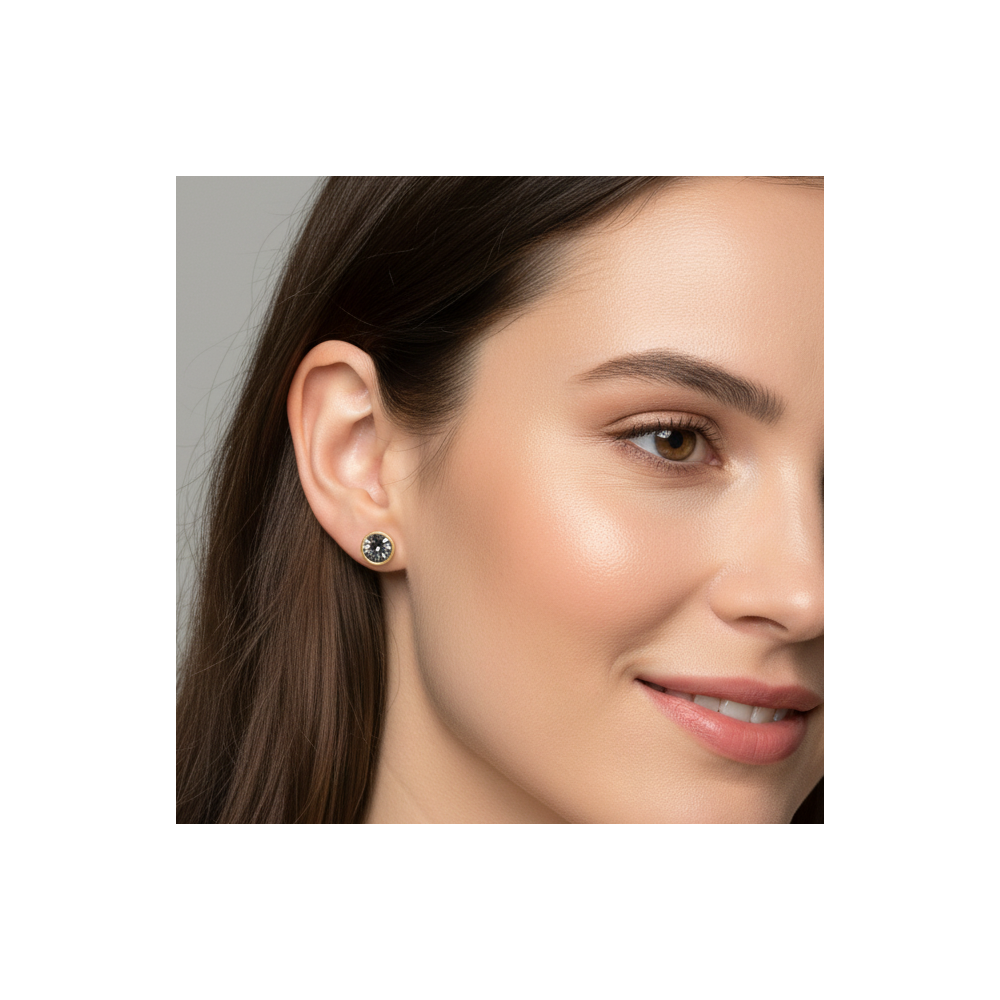 L’acier inoxydable plaqué or ne ternit pas et ne change pas de couleur avec le temps. Le cristal Swarovski® 6 mm, monté dans un serti rond 8 mm, accroche la lumière en créant des reflets argentés profonds et hypnotiques.