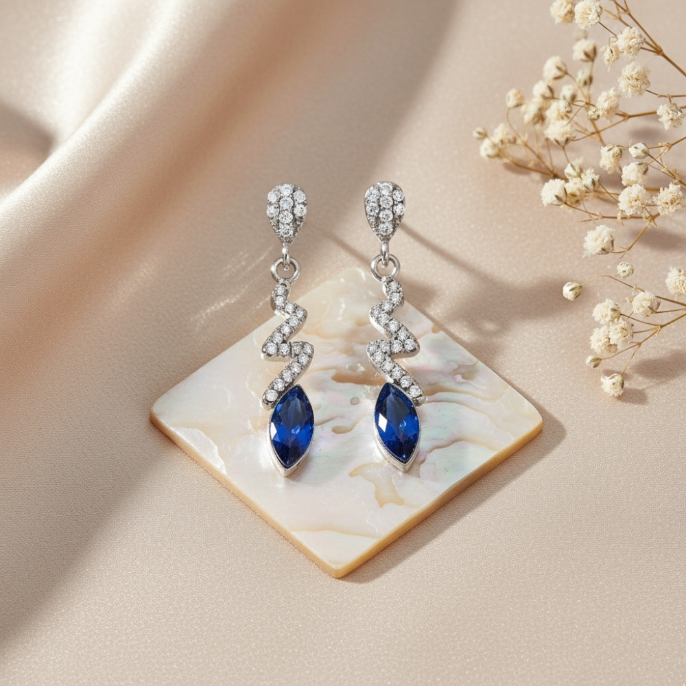 Les boucles d’oreilles SERPENTIN incarnent l’élégance moderne et la finesse lumineuse, grâce à leur design ondulé rappelant une ligne serpentine délicatement pavée d’éclats. Réalisées en argent sterling 925, elles se distinguent par leurs courbes scintillantes serties de cristaux blancs Swarovski® et par une superbe pierre bleue taillée en navette, qui attire la lumière avec intensité.