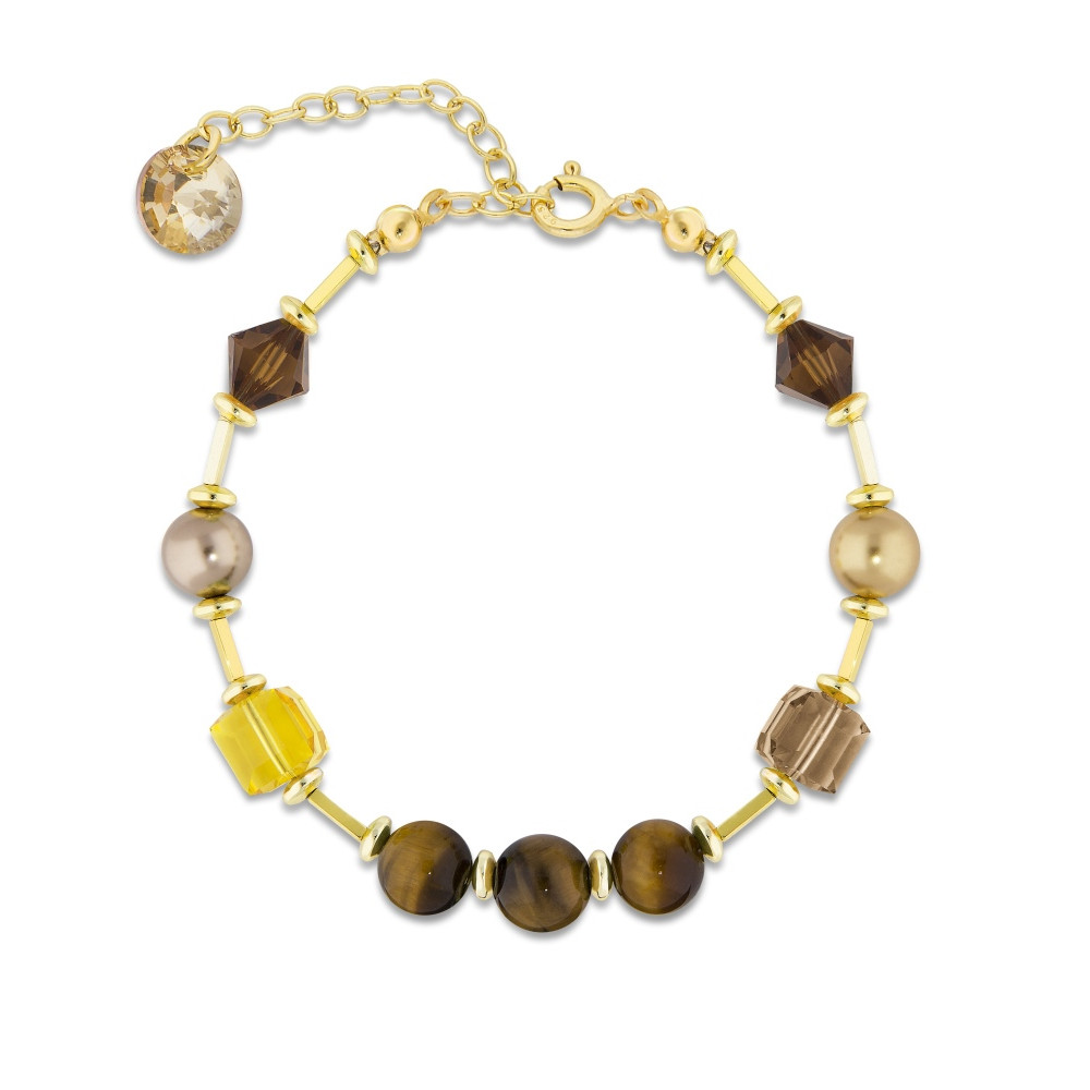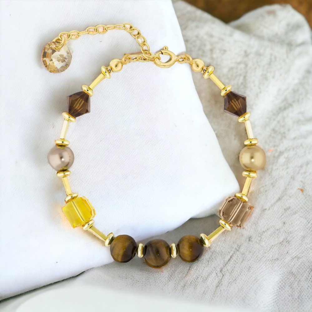 Collier en argent sterling 925 plaqué or, hématite, pierres naturelles Oeil de Tigre, cristaux autrichiens de couleur Light Colorado Topaz, Light Topaz et Smoked Topaz et Crystal Pearls de couleur Bronze et Bright Gold.