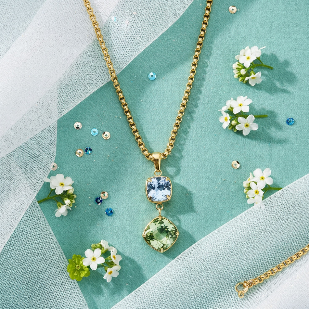 Le MIRAGE est un collier sophistiqué au design lumineux qui associe harmonieusement deux cristaux Swarovski® délicatement facettés, dans des nuances bleu tendre et vert clair. Son pendentif double pierre de 42 mm offre un mouvement gracieux et une profondeur visuelle qui captent la lumière à chaque geste. Raffiné et féminin, ce collier apporte une touche de couleur élégante tout en conservant une allure joaillière.
