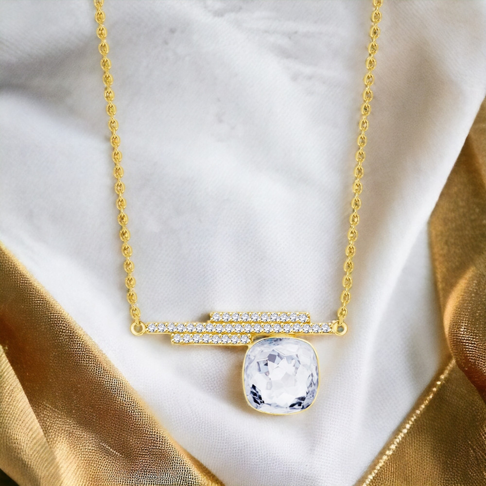 La combinaison du cristal carré et des trois lignes de zircones crée un équilibre harmonieux entre design contemporain et glamour intemporel. Qu'il soit porté comme point central d'une tenue formelle ou pour ajouter une touche de luxe à une tenue de tous les jours, ce collier laissera certainement une impression durable, ce qui en fera un ajout précieux à toute collection de bijoux.