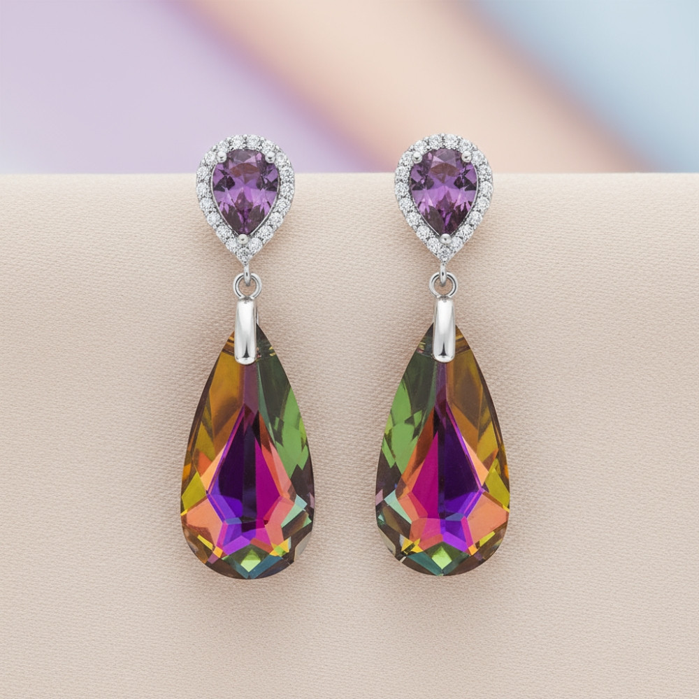 LUMESSA to wyjątkowy model, który odbija światło w niepowtarzalny sposób. Kolczyki wykonane ze srebra próby 925 łączą intensywny, wielobarwny kryształ Swarovski® Vitrail Medium z delikatnym fioletowym kryształem otoczonym błyszczącymi akcentami.