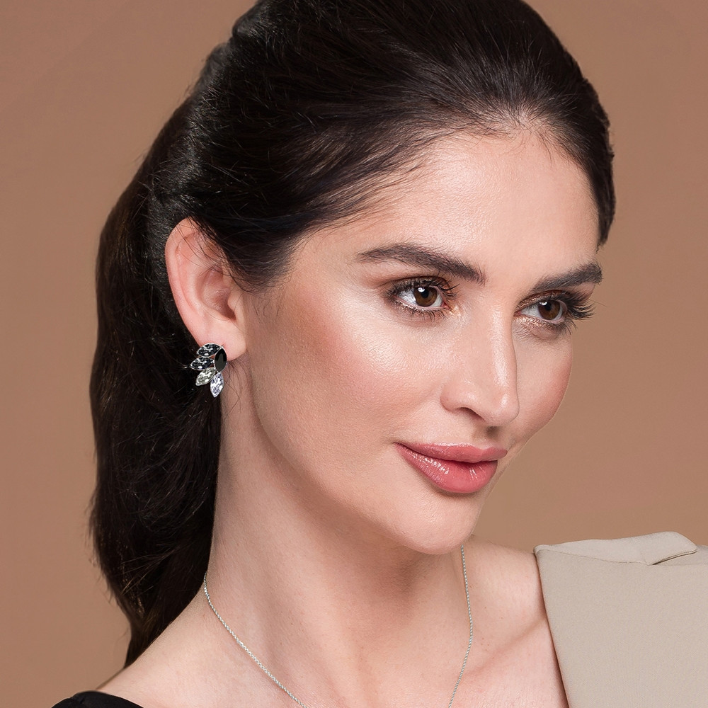 Kolczyki wykonane z pozłacanego srebra próby 925 oraz austriackich kryształów w kolorze Silver Night, Jet i Crystal.Długość kolczyków: 2,2 cm.