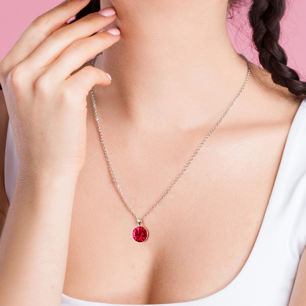 Srebrny naszyjnik z okrągłym kryształem w rubinowym kolorze.