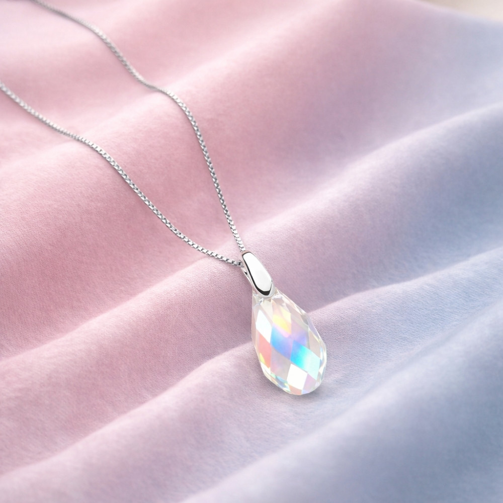 Naszyjnik BRIOLETTE to połączenie lekkości, elegancji i ponadczasowego stylu. Wykonany z srebra próby 925, ozdobiony białym kryształem Swarovski® w kształcie kropli, pięknie odbija światło i delikatnie rozświetla dekolt.