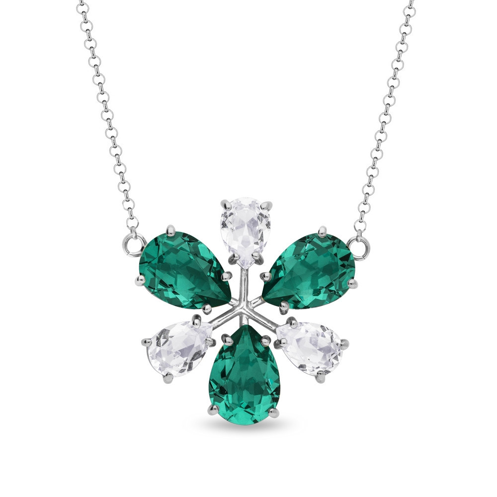 Naszyjnik wykonany ze srebra próby 925 pokrytego platyną oraz austriackich kryształów w kolorach Emerald i Crystal.Długość naszyjnika: 47 cm (42 cm + 5 cm przedłużka). Wielkość kryształów: 1,4 cm i 1 cm.