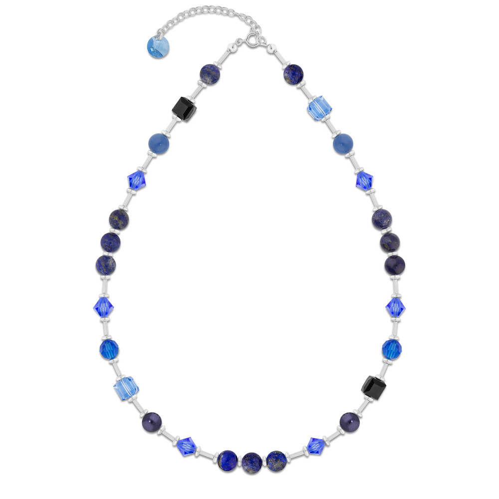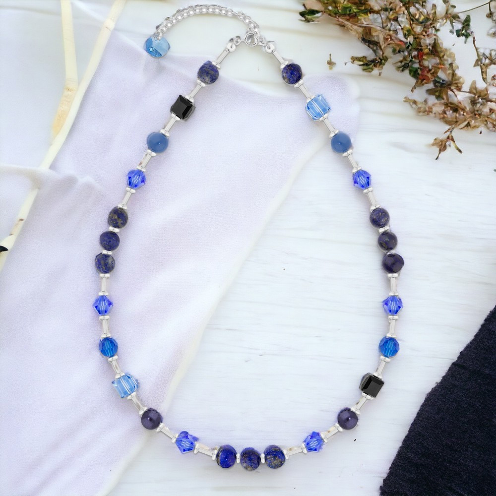 Bransoletka wykonana ze srebra próby 925, hematytów, kamieni naturalnych Lapis Lazuli, austriackich kryształów w kolorze Aquamarine, Jet i Sapphire oraz kryształowych pereł w kolorze Lapis i Dark Purple.
